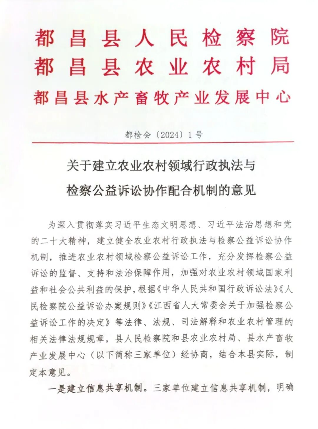 会上,三方共同会签《关于建立农业农村领域行政执法与检察公益诉讼协作配合机制的意见》(以下简称《意见》),对加强农业农村领域行政执法与检察公益诉讼的协作配合,做好信息共享、线索移送、业务交流、会商研判、宣传引导等工作进行规范,要求检察机关与行政机关强化协作联动、建立长效机制,做到分工负责,互相配合,形成合力,确保行政执法权、检察权依法有效行使。