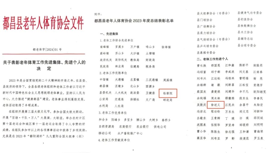 都昌县检察院荣获“2023年度全县老年体育工作优胜单位”、徐述义同志荣获“2023年度全县老年体育工作先进个人”